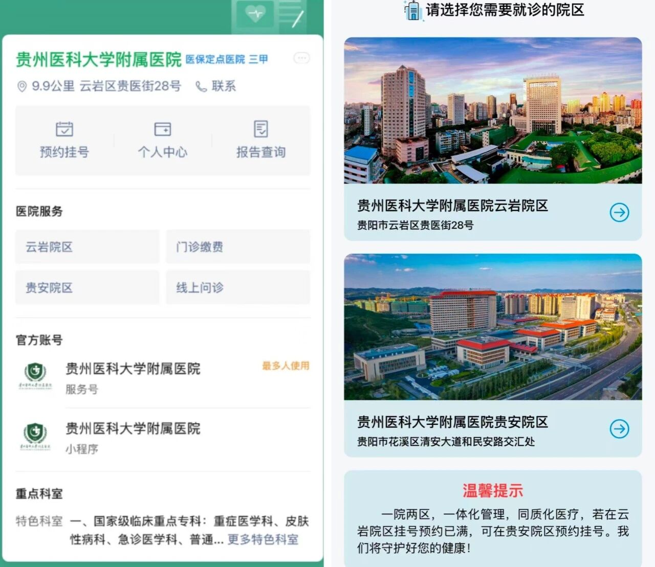注:贵安院区是贵州医科大学附属医院与中山大学附属第一医院共建的国家区域医疗中心、三级甲等公立医院,贵安院区与云岩院区,一体化管理,同质化医疗,若在云岩院区挂号预约已满,可在贵安院区预约挂号。