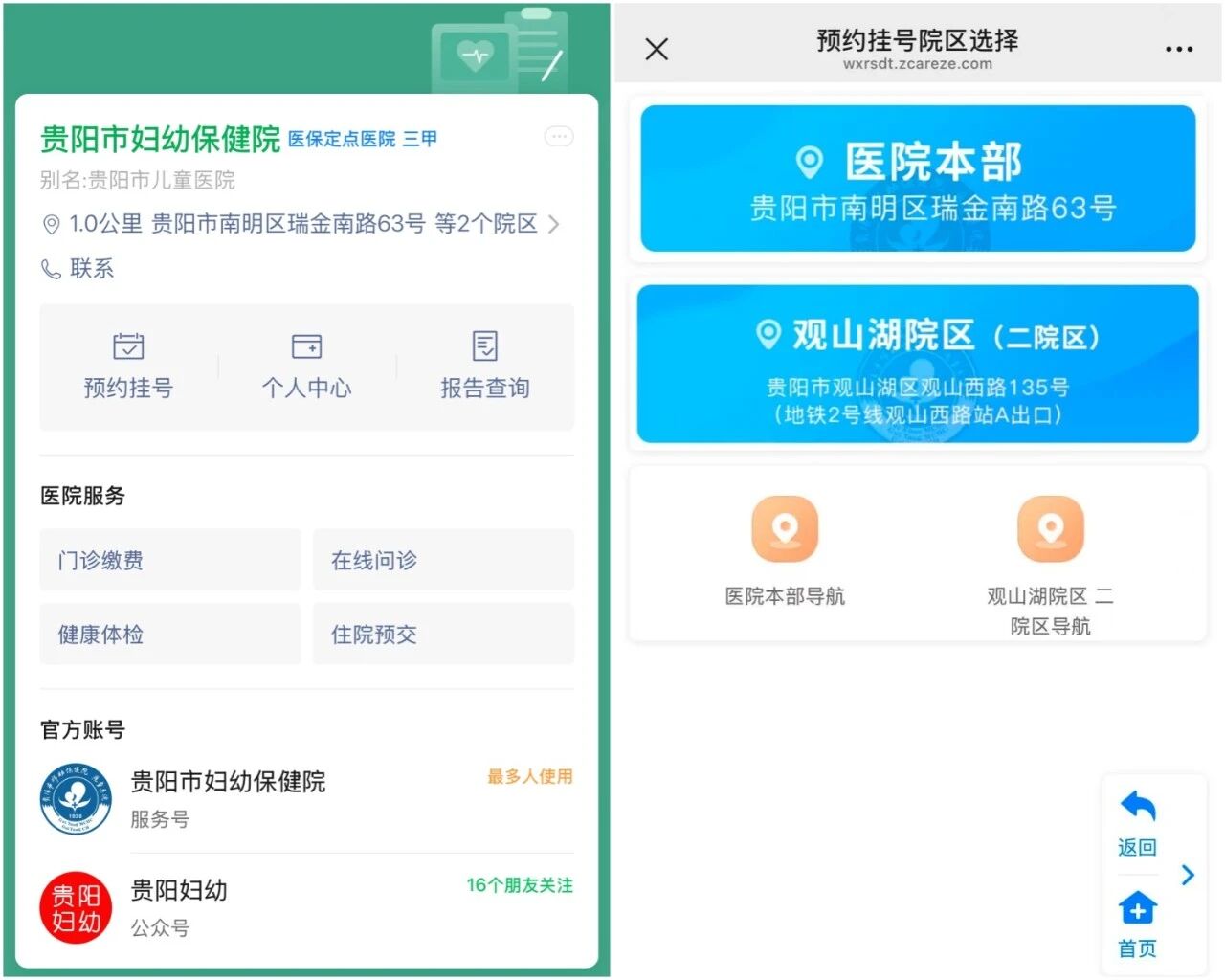 微信搜索“贵阳市妇幼保健院”小程序,登录个人信息,在线选择院区、科室、医生和就诊时间,即可轻松完成挂号,方便又快捷。