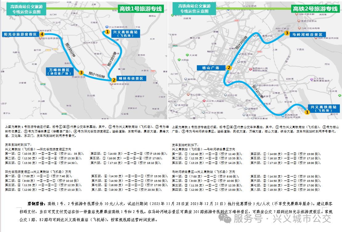 兴义市高铁南站即将开通运营,根据高铁开通列车对数及时刻表。按照上级要求,为高效整合运营资源,计划将现有4条(<1路万峰林机场-木贾公交枢纽>、<82路万峰林机场-顶效小龙潭>、<303路万峰林机场-峰林布衣景区-万峰林景区>、<304 路万峰林机场马岭河峡谷景区-阳光谷旅游度假景区>)机场公交线路调整至高铁南站进行发班,高铁南站公交停车场设置为首末公交枢纽站,万峰林机场公交站点设置为中途站(经停站),以上4条线路均从高铁南站发班后途经机场公交站进行绕行营运,同时兼顾机场和高铁南站的客流出行需求,具体调整如下: