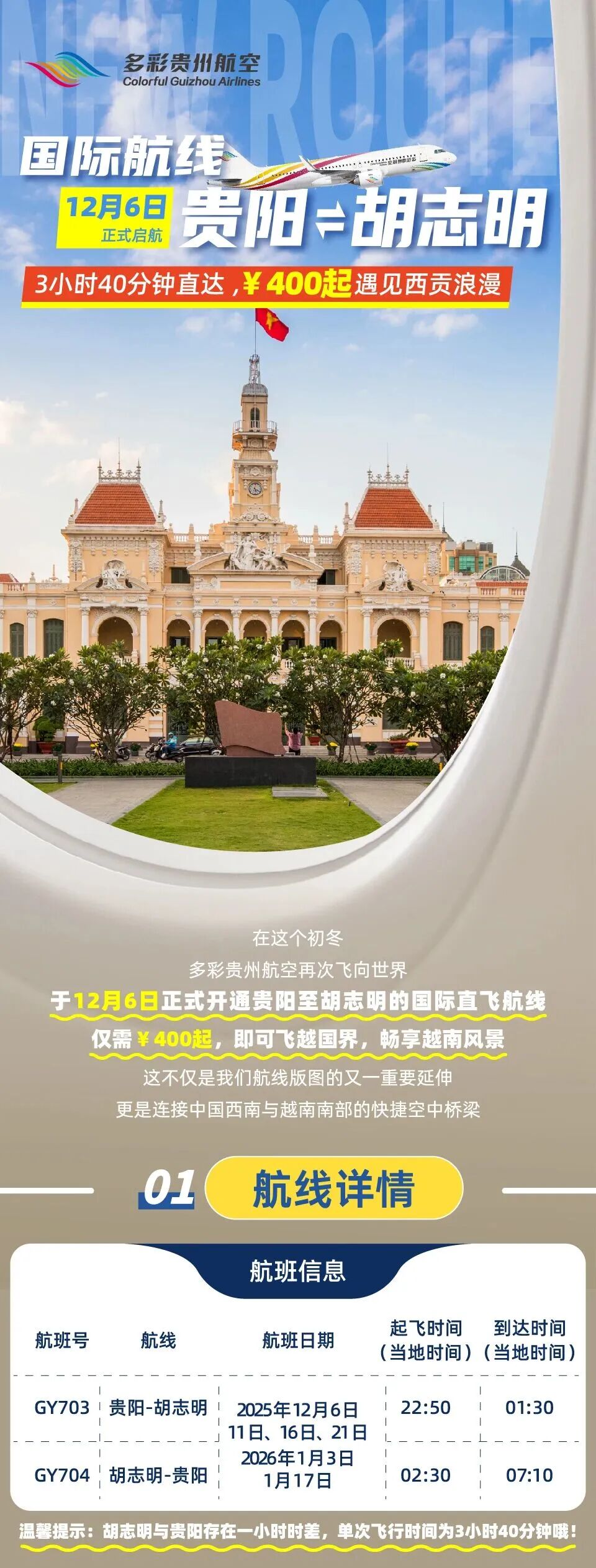 为服务贵州高水平对外开放,助力黔越两地经贸与人文交流,多彩贵州航空于2025年12月6日正式开通贵阳-胡志明往返直飞国际航线。一条全新的空中桥梁即将贯通,为您的东南亚商务出行与休闲度假,提供更便捷、更优质的选择。
