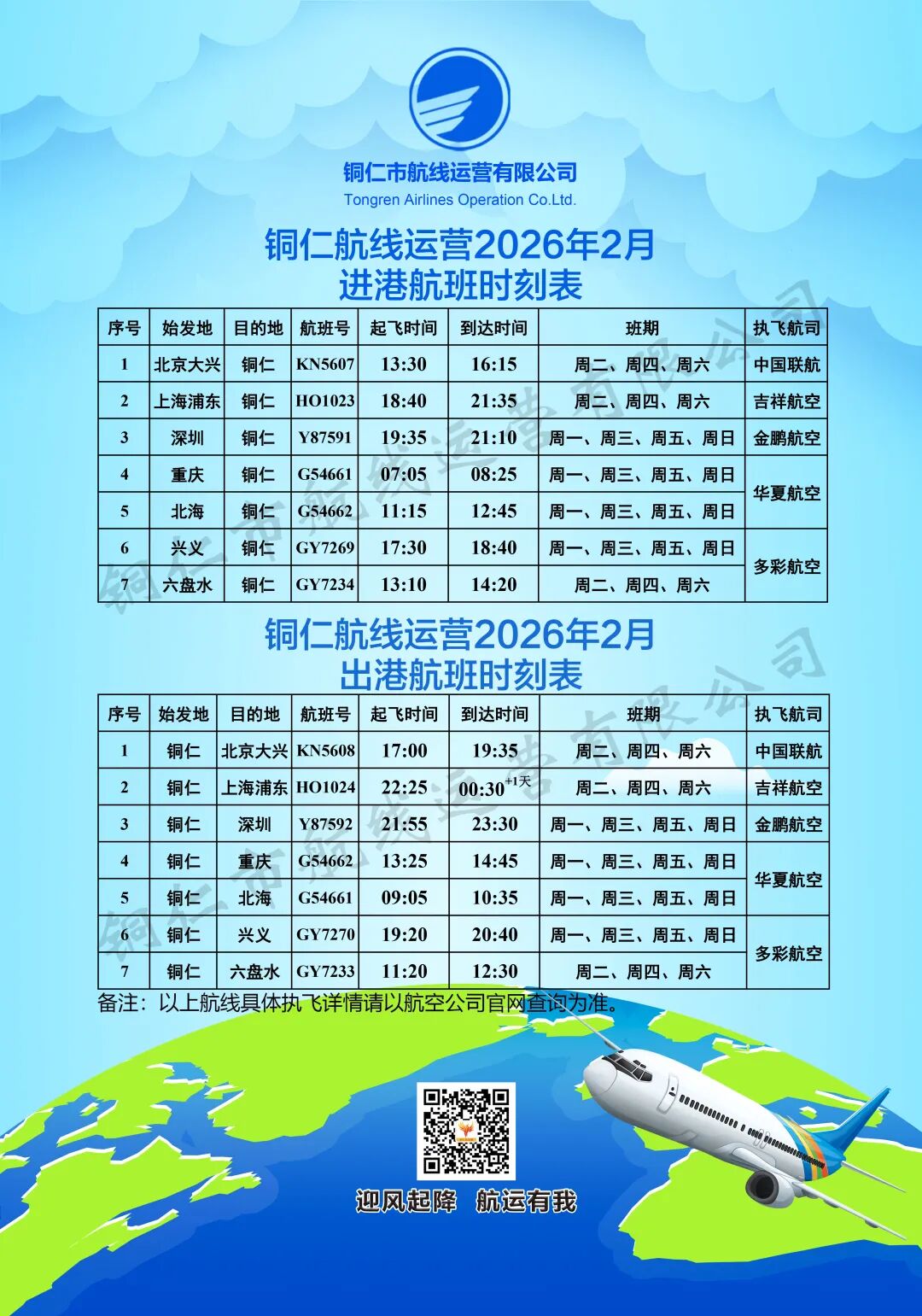 根据相关航空公司航班执行计划,铜仁市2026年2月部分航线的执飞班期和时刻有调整,具体执飞信息如下: