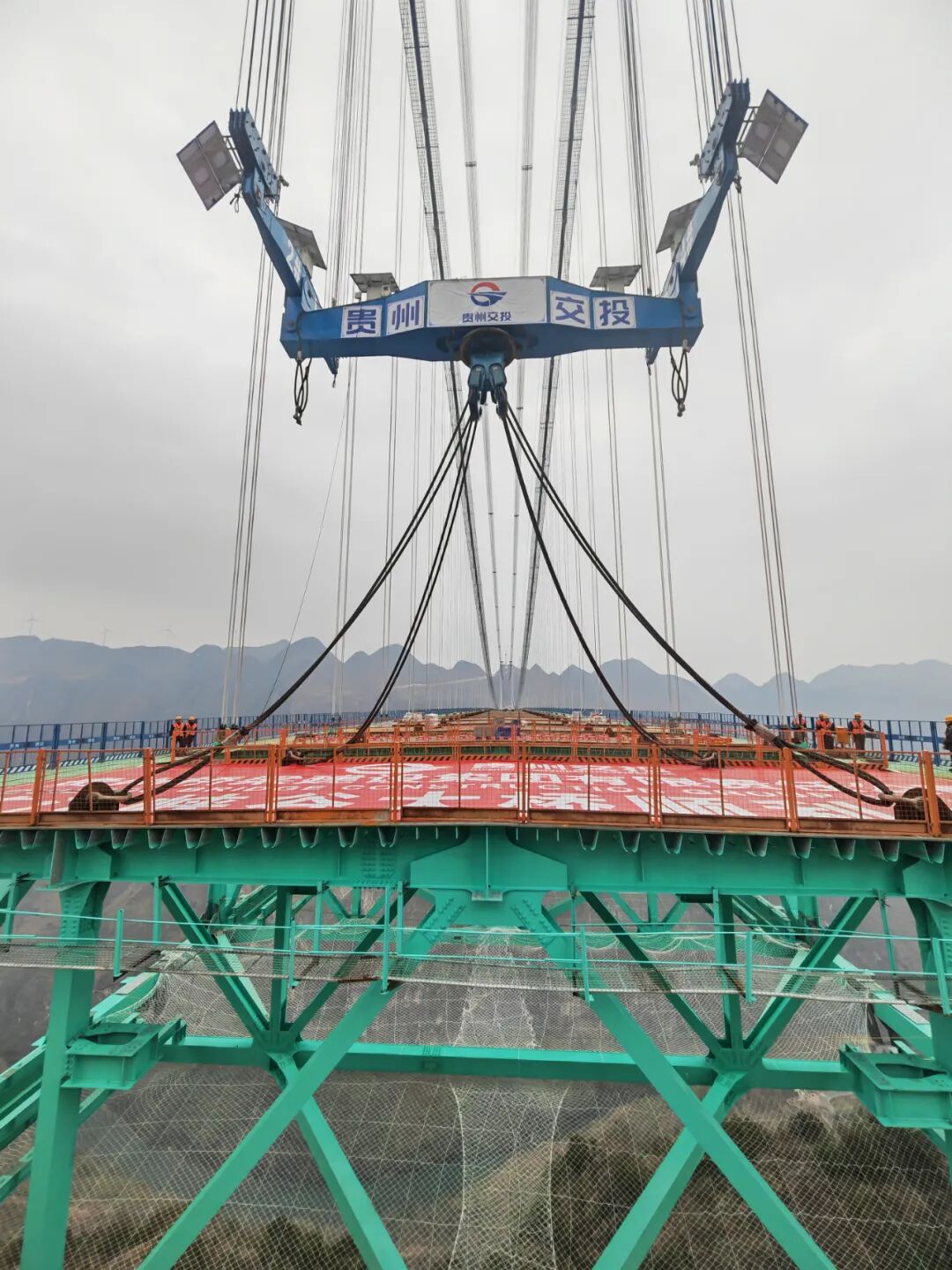 据悉,花江峡谷大桥是超大跨径钢桁梁悬索桥。全桥共93个钢桁梁节段,梁段总重量达2.1万吨。大桥从2024年11月4日开始首节段吊装,去除吊装期间电力系统检修和不利天气因素,项目建设团队仅用两个月时间完成了全部钢桁梁吊装作业,向世界展现了桥梁建设的“贵州速度”,以优异的成绩迎接贵州两会。