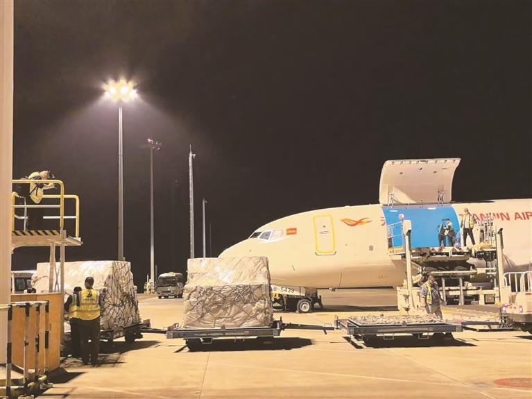 近日,源源不断的货物在贵阳龙洞堡国际机场登上飞往达卡的货机。(受访者供图)