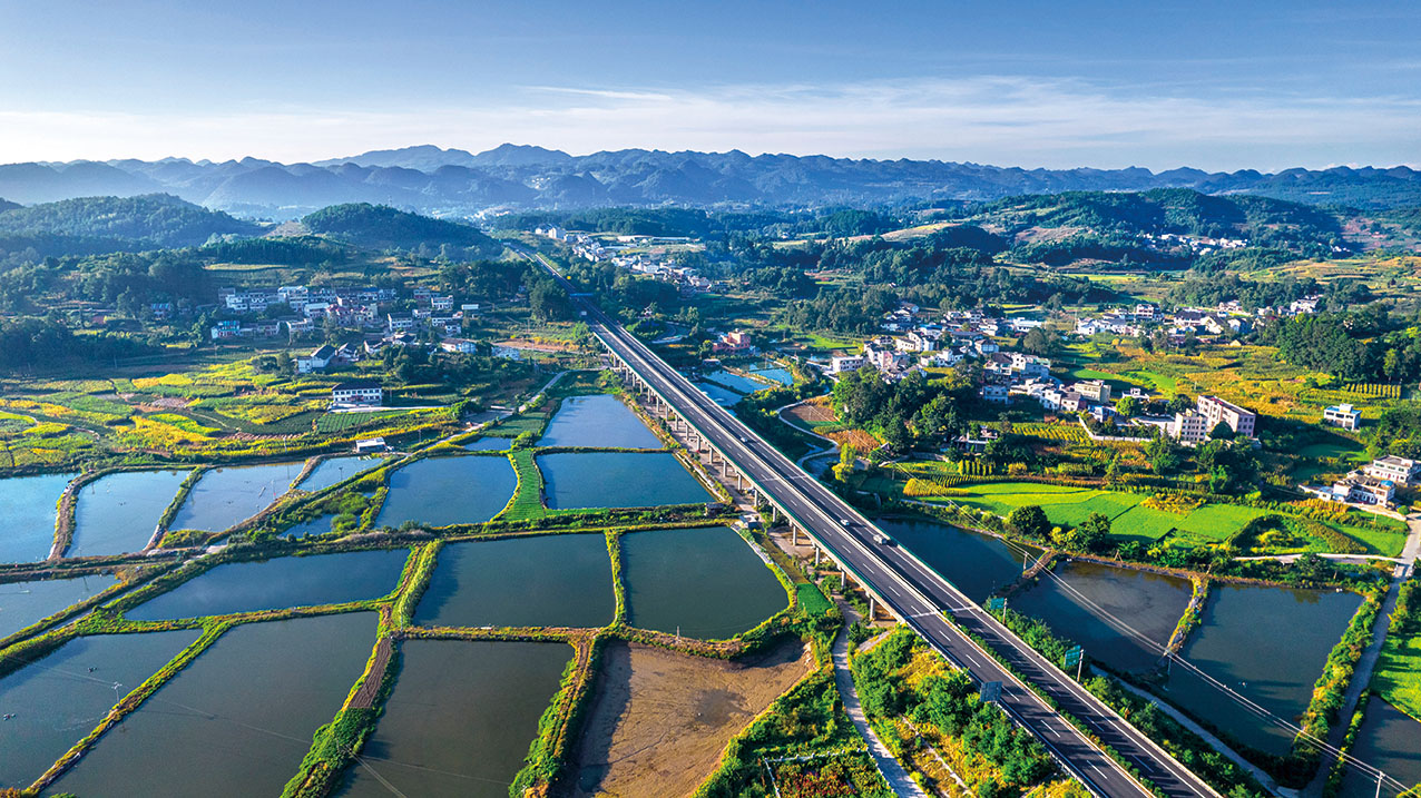 作为交通强国建设试点省份,贵州以“逢山开路、遇水架桥”的奋斗精神,掀起了一场场交通建设热潮。图为高速公路穿过黔西市雨朵镇扯泥村生态渔业养殖基地_史开心 摄(影像贵州)