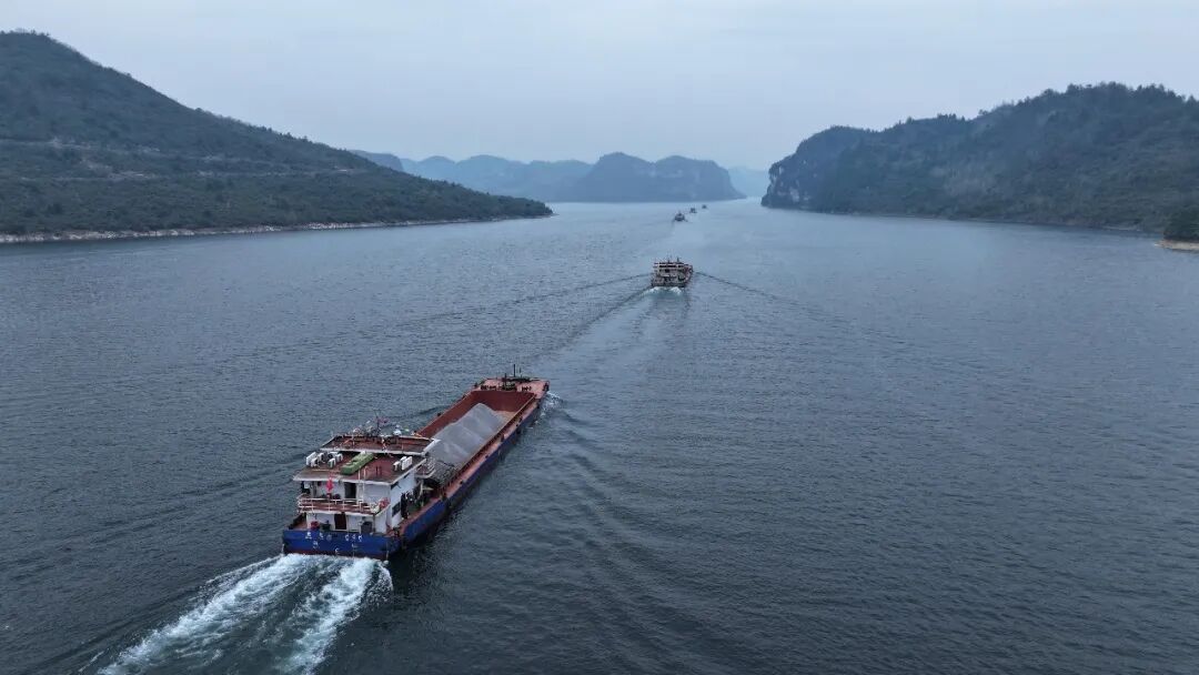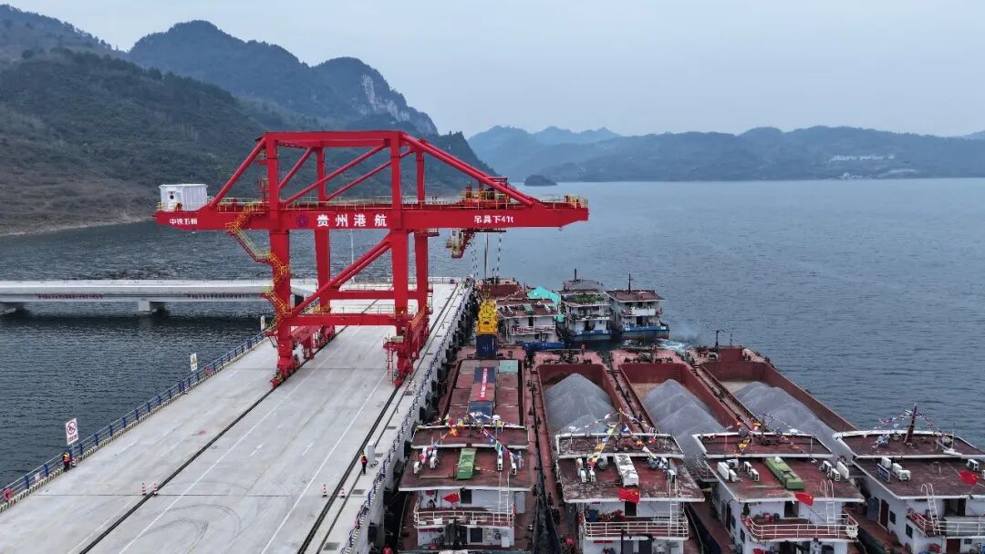 12月16日,随着汽笛长鸣,一台桥式起重机将装有沉淀硫酸钡的集装箱吊入“航电624”货船,这标志着贵州首个自动化码头——瓮安港云中港区正式开港。