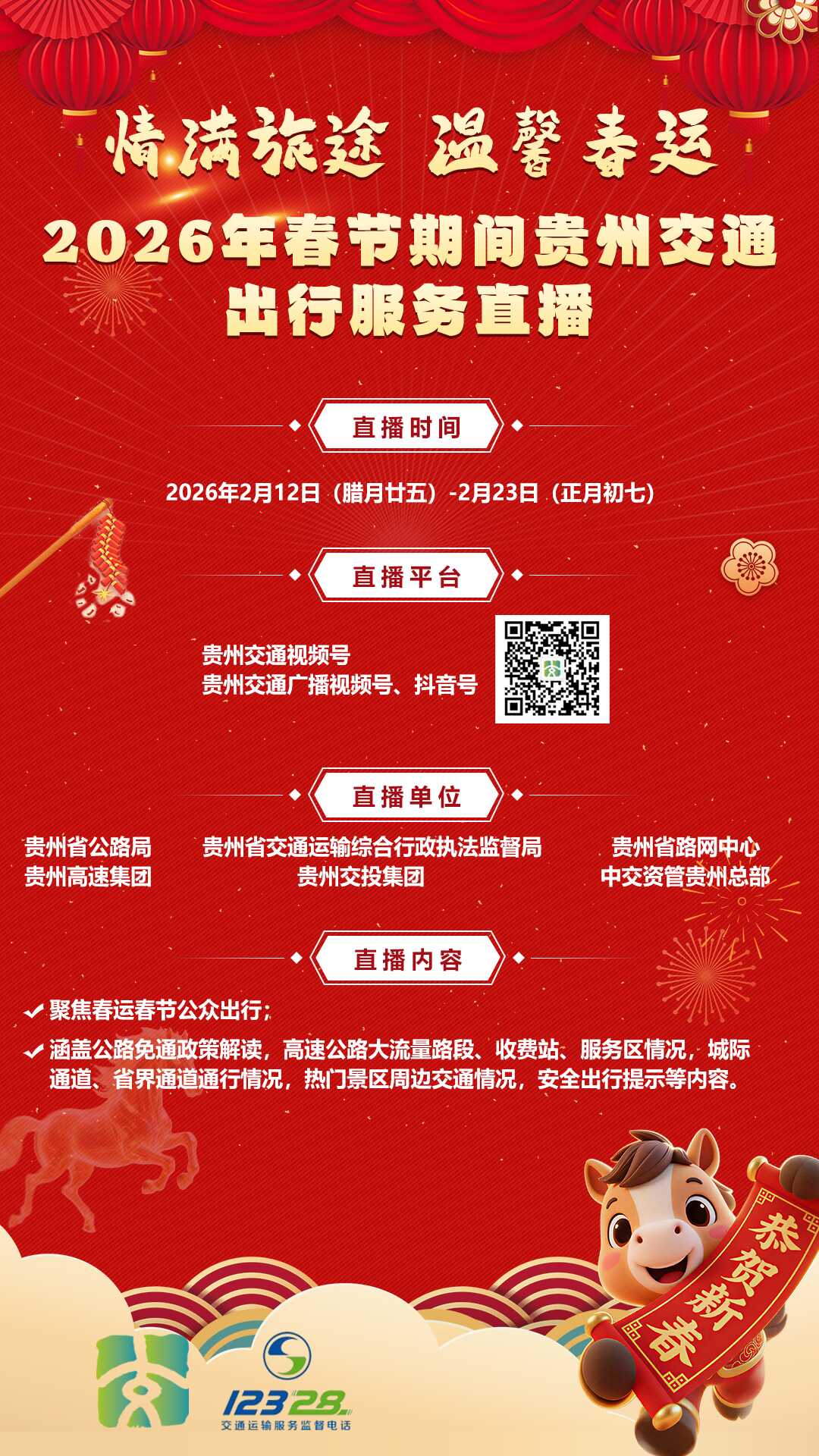 为全力服务您的春运(春节)出行,2月12日(腊月廿五)至2月23日(正月初七),贵州省交通运输厅将组织多家单位,推出“情满旅途 温馨春运”系列联合直播,全程陪伴您的旅途!