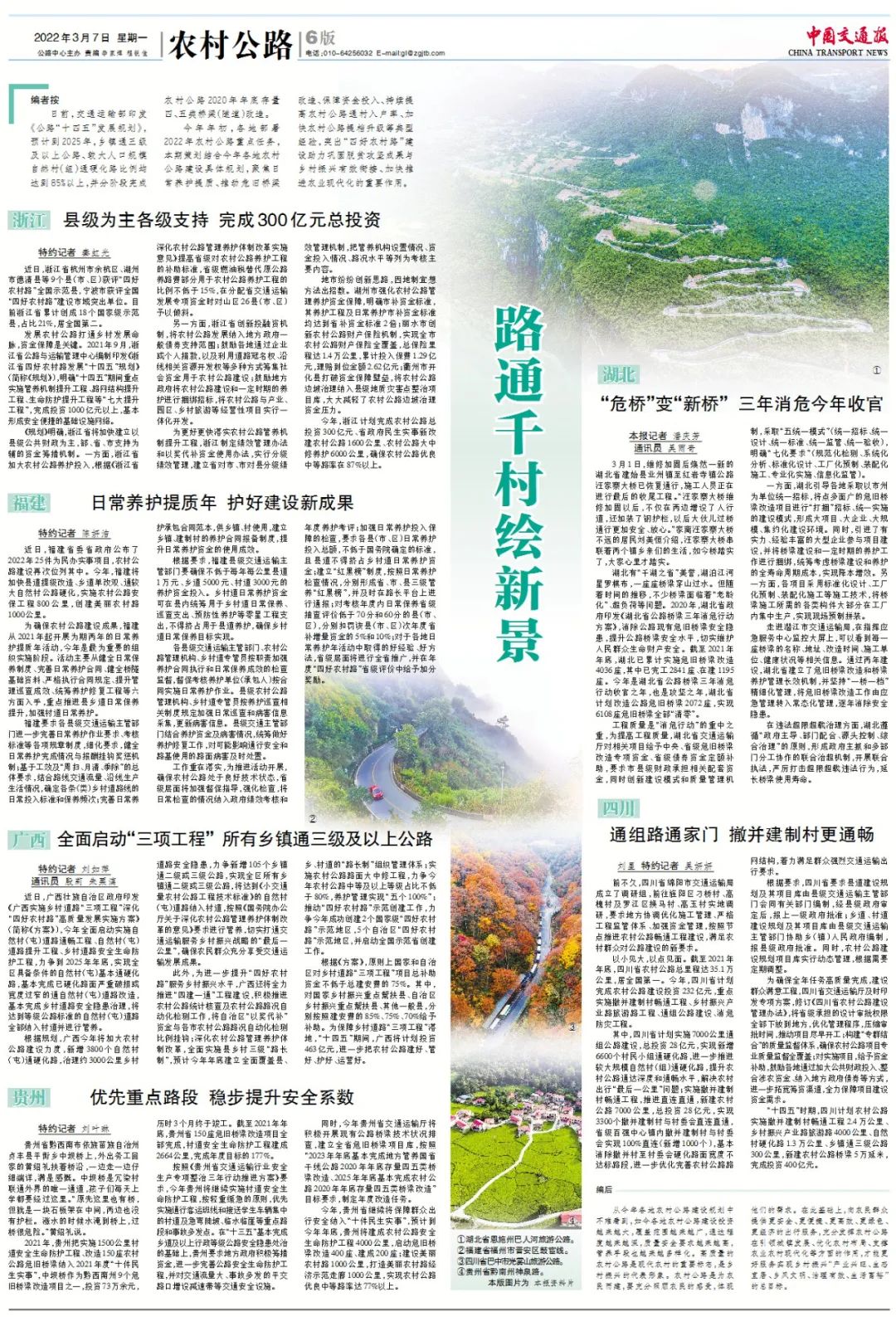 今年年初,各地部署2022年农村公路重点任务,本期策划结合今年各地农村公路建设具体规划,聚焦日常养护提质、推动危旧桥梁改造、保障资金投入、持续提高农村公路通村入户率、加快农村公路提档升级等典型经验,突出“四好农村路”建设助力巩固脱贫攻坚成果与乡村振兴有效衔接、加快推进农业现代化的重要作用。