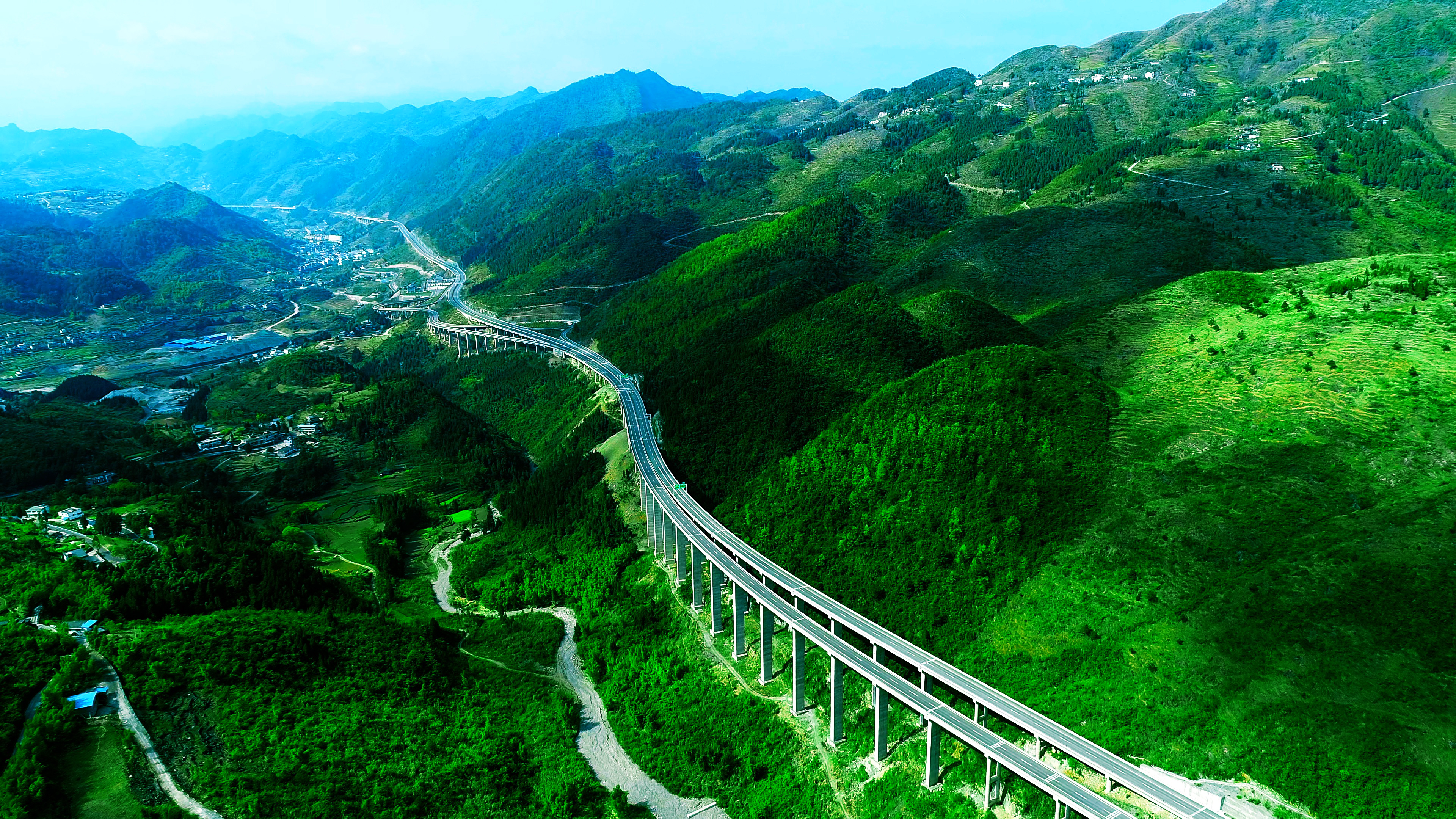 蓝天为布,青山作廊,崭新的高速公路犹如一条巨龙,于崇山峻岭间蜿蜒而过。在巍巍山峦中,森林、湖泊、溪流与公路遥相呼应,大美黔地一派和谐生态的自然图景。