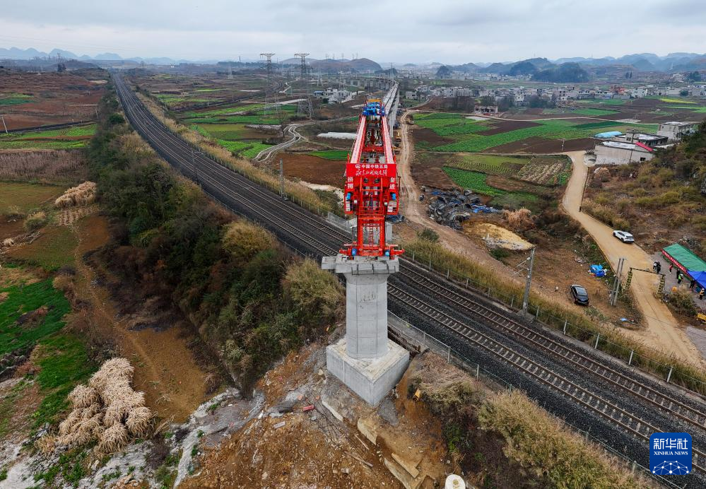 当日,在贵州省安顺市境内,作业人员操纵架桥机,将重约135吨的32米T梁成功架设在斗篷山特大桥30-31号桥墩间。新建沪昆铁路至安六铁路客车联络线成功上跨既有沪昆铁路,工程建设取得进展,为项目早日建成通车奠定基础。