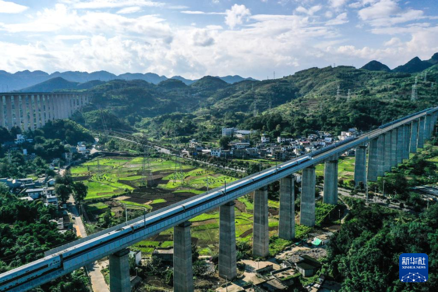 10月17日,运行试验列车经过贵州盘兴高铁三标段清水河镇特大桥(无人机照片)。