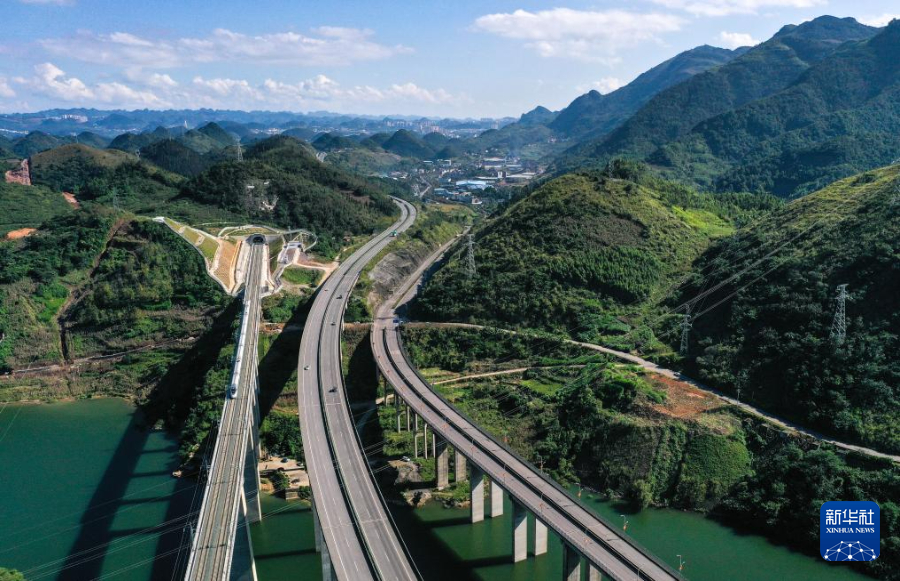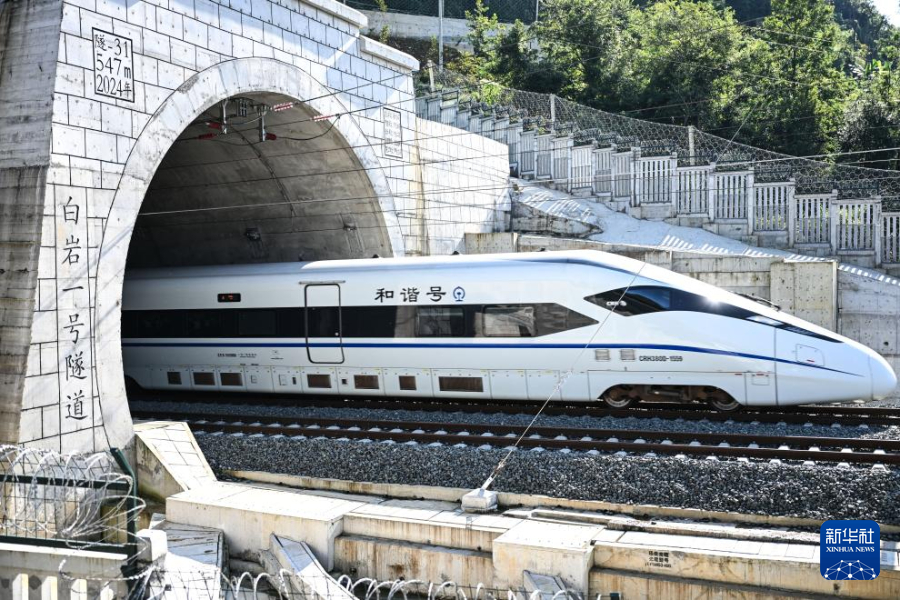 10月17日,运行试验列车经过贵州盘兴高铁三标段白岩一号隧道(无人机照片)。