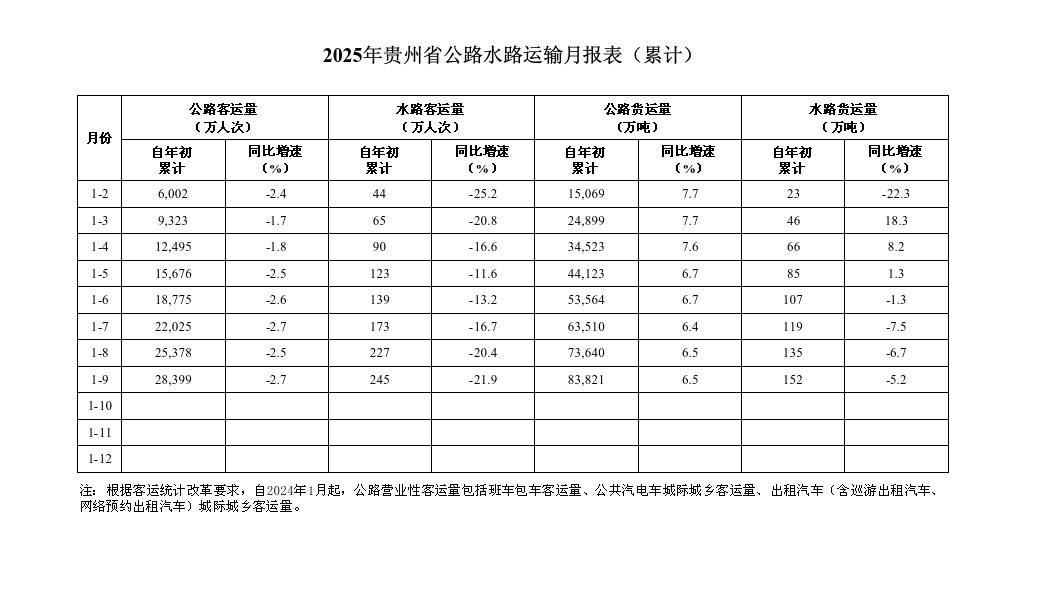 2025年1-9月贵州省公路水路运输月报表