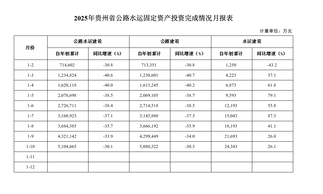 2025年1-10月贵州省公路水运固定资产投资完成情况