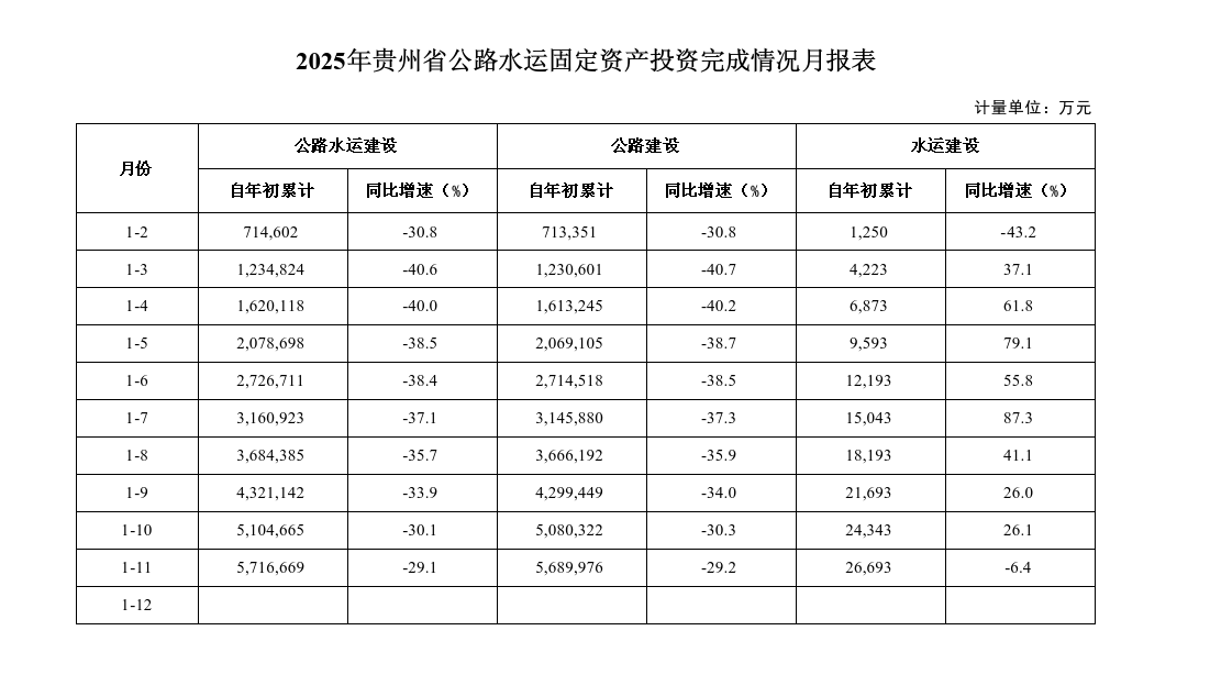 2025年1-11月贵州省公路水运固定资产投资完成情况
