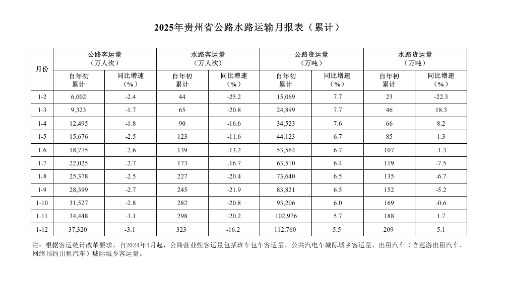 2025年1-12月贵州省公路水路运输月报表