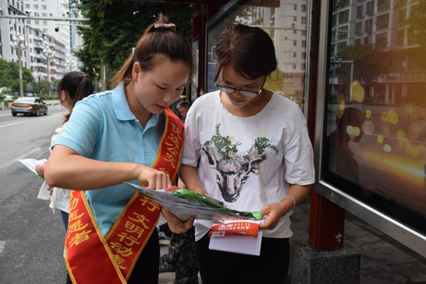 志愿者向市民宣传公交优先知识