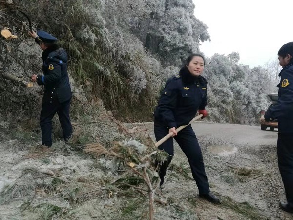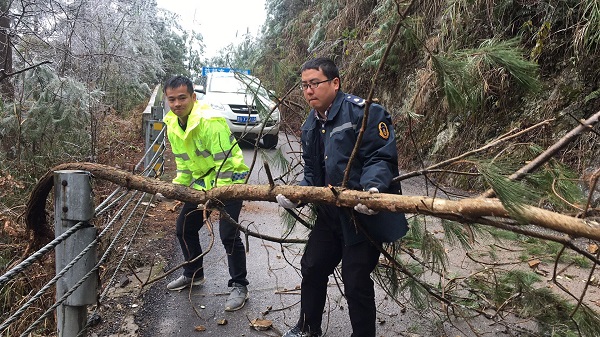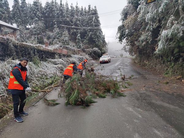 丹寨县农村公路局正在清除路面上被冰雪压垮的树枝 丹寨县农村公路局 提供