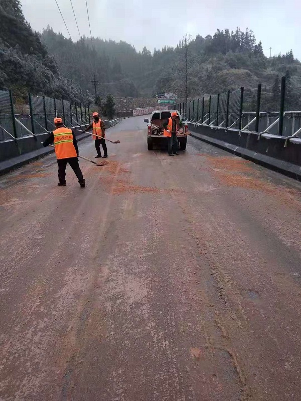 凯里,5个片区1个巡查小组和1个应急机动组24小时巡查。重点加大对高海拔、坡陡弯急、临崖临水、地质灾害点等路段的巡查力度,白天查、夜晚查,发现隐患立即治理,设置警示标志牌,提醒过往车辆行人。巡查发现,炉山至下司快速通道部分桥面有结冰现象,为了保障出行安全和道路畅通,道路巡查组随即出动路政巡查、养护车辆各1辆,路政员和养护人员共10名,立即前往凝冻路段设置安全警示标志、铺撒除冰工业盐、提醒来往车辆注意行车保证通车安全,经过2小时的紧张作业,该路段隐患消除,有效避免了因凝冻而引发的道路交通事故。截至12月10日,凯里市交通运输局共出动路政、养护人员150余人次,巡查车辆40辆次,共铺撒除冰工业盐3吨。