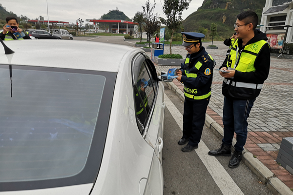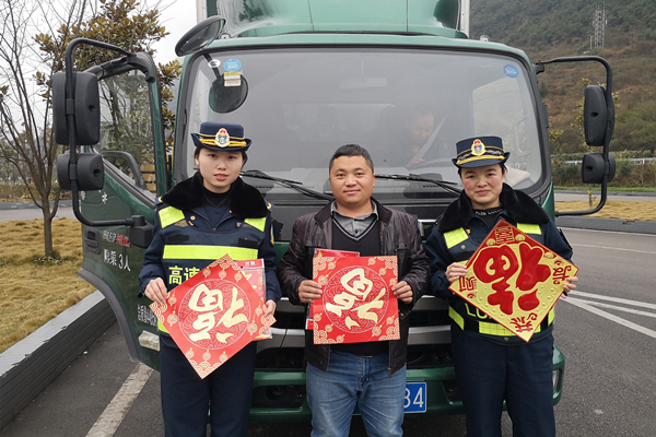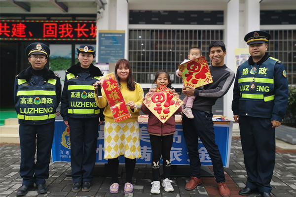 在服务区,一家四口从浙江金华返回宣威老家过年,到达岩脚服务区时,找不到厕所,路政员主动引导他们去了服务区超市里面的厕所,出来时还给他们送上了春联和“福”字。临别时,孩子爸爸说:“收到你们的送的“福”气,感觉很开心,我想和你们拍张照片,把“福”气分享出去”。一个长途货车驾驶员,看见我们在服务区不停的发春联、送“福”气,还给别人指路,发放安全宣传折页叮嘱行车路上要注意的安全事项,他这样说:“接到你们送的“福”气,我这趟肯定是幸福满满,满载福运而归”。