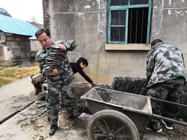 组织的民兵应急分队在帮助受灾群众传运瓦片