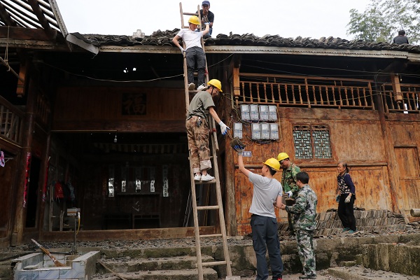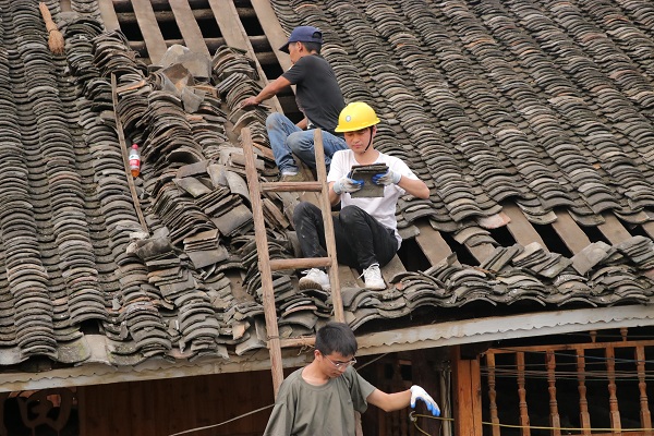 在受灾户家帮助搬运瓦片