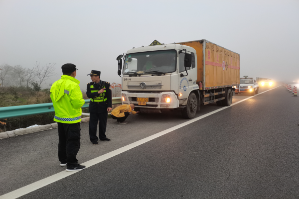 经过询问了解到,该车装载有9吨炸药,出现发动机烧机油故障,因而无法继续行使,驾驶员遂将车停靠在应急车道上,还未来得及设置安全警示标志,就遇到了巡查至此的路政执法人员。当时该路段大雾弥漫,行车视线不佳,过往车辆都开着防雾灯,加之天色渐晚,气温不断下降,看着身边疾驰而过的车辆,路政执法人员不禁绷紧了心弦。