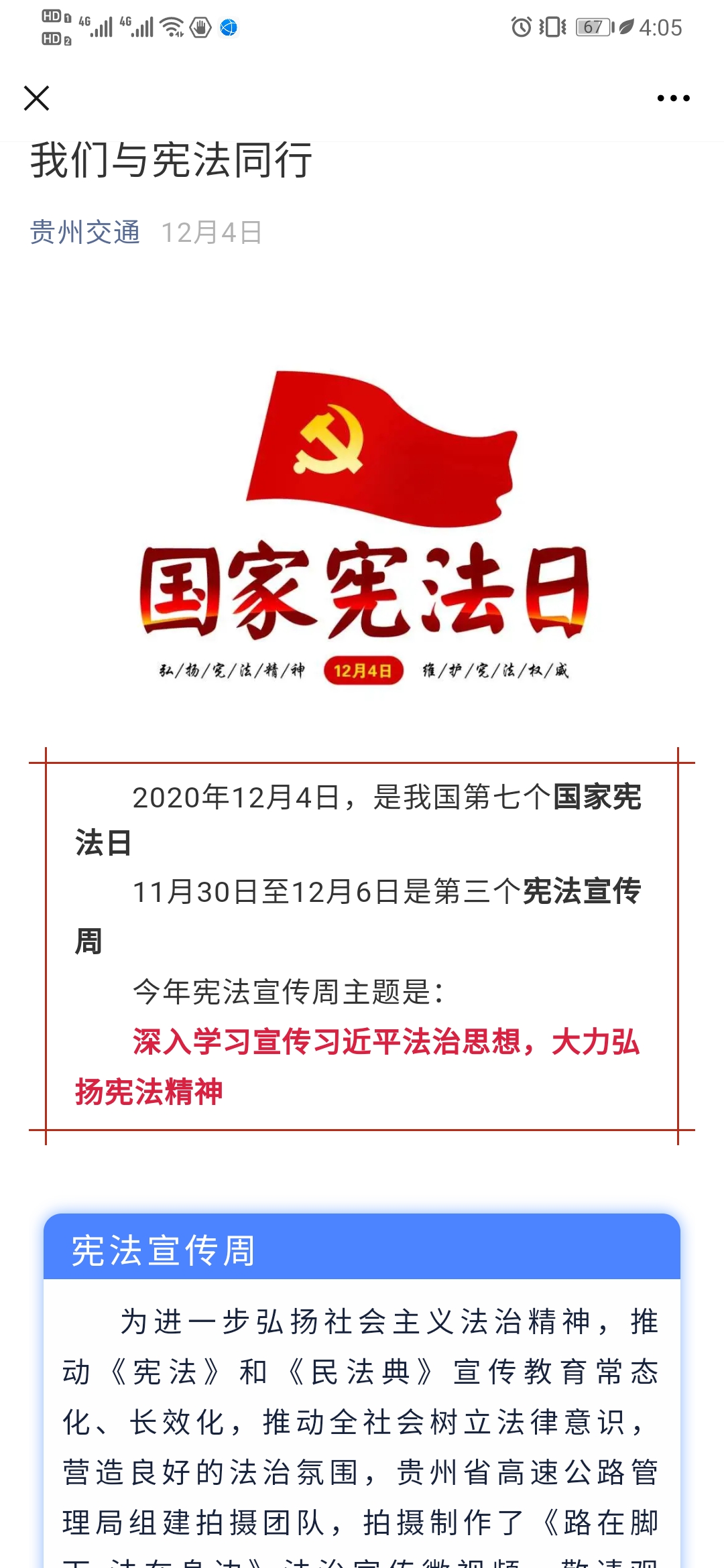 12月4日上午,省交通运输厅组织厅属有关单位在贵阳汇金星力广场开展“12.4”国家宪法日宣传活动,通过发放宣传资料,开展现场法律咨询等形式推进宪法和民法典的宣传普及。