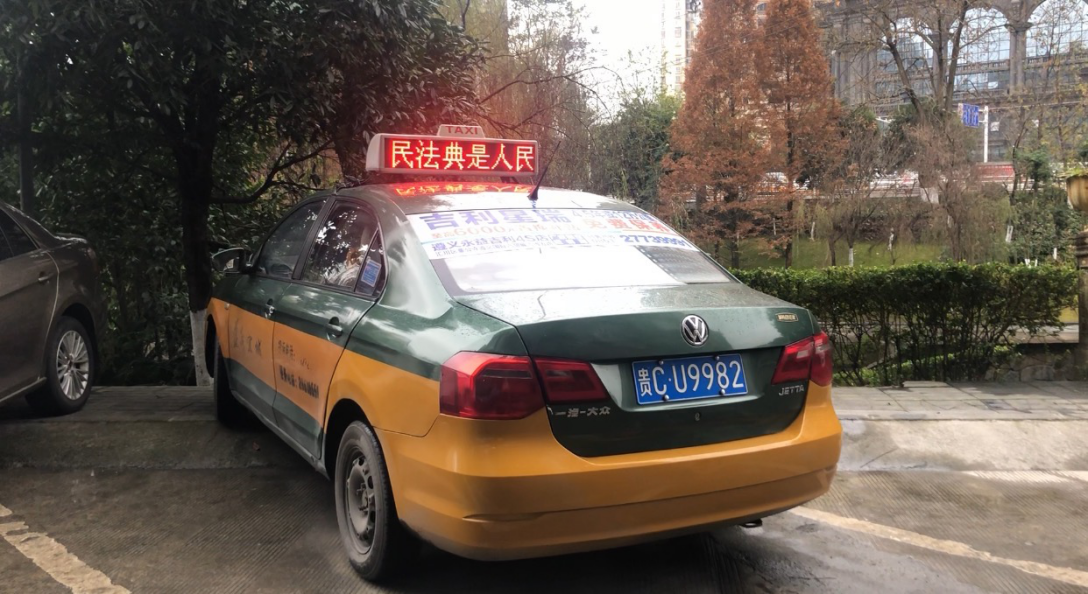 遵义出租车滚动播放宣传标语——民法典是人民美好生活的法治保障