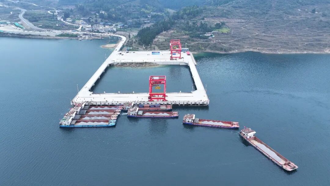 12月16日,随着汽笛长鸣,一台桥式起重机将装有沉淀硫酸钡的集装箱吊入“航电624”货船,这标志着贵州首个自动化码头——瓮安港云中港区正式开港。