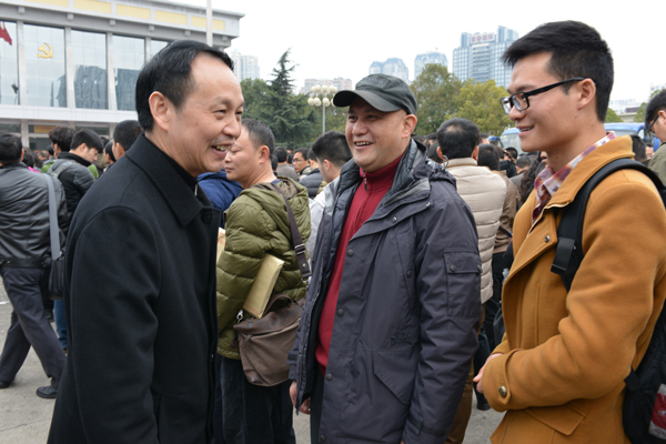 在省委大礼堂前的广场上,即将出发的省交通运输厅同步小康驻村队员相互交流,大家都表示要学的、要做的有很多,要学会耐心细致化解矛盾,督促落实民生政策,促进乡村和谐,力所能及帮助村民得实惠。