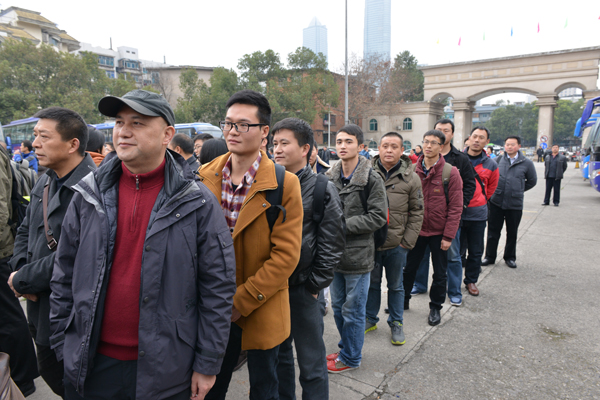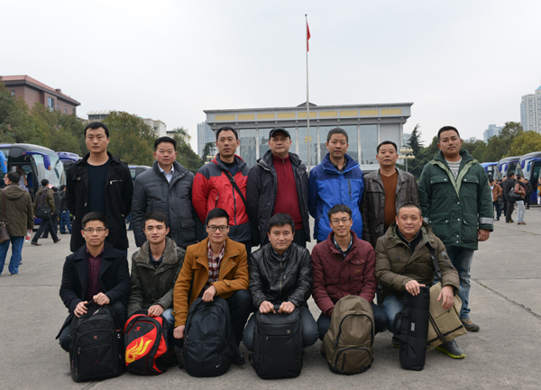 3月9日上午,厅选派的2015年部分驻村干部在省委礼堂广场参加出发仪式。上左起:贵州交通职业技术学院张牧元、省道路运输局田坤、贵州交通职业技术学院韩志要、贵州省交通建设工程造价管理站许明雷、贵州高速公路集团有限公司金龙、贵州交通建设集团有限公司邱秀忠、贵州高速公路集团有限公司张家魁;下左起:贵州省地方海事局(航务管理局、通航管理局)宋刚、贵州省交通建设工程质量监督局张宏达、省高速公路管理局赫章路政执法大队阳祥、贵阳公路管理局朱旺、贵州交通技师学院罗国爵、贵州交通建设集团有限公司邓永忠。