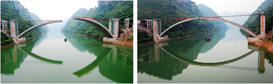 转体过程从清晨持续到中午,两岸各4100吨重的主拱圈经过工人们4多小时的努力,于11时56分成功实现对接。据大桥承建方贵州省公路桥梁工程总公司技术人员介绍:大桥主拱圈转体合龙后,将加紧上部结构和引道的施工,预计今年内可建成通车。