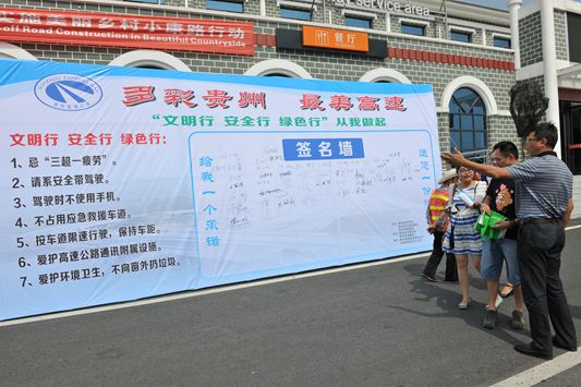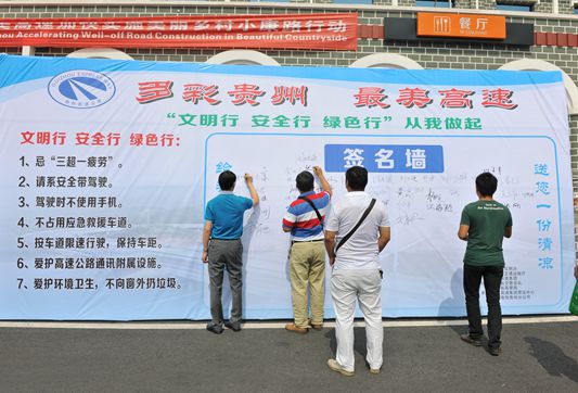 8月21日上午10时,以“‘多彩贵州 最美高速’-----安全行、文明行、绿色行、从我做起”为主题的大型签名活动在全省5个高速公路服务区同步举行,旨在呼吁司乘人员共同营造安全、文明的行车环境。