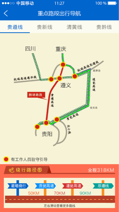 黔通途不仅贵州省内可以查,对周边省份高速公路的车流量也可进行预判。包括重庆、四川、云南、湖南、广西、广州等6个省市,甚至还可以提前查周边省份商圈、高速、景区、轻轨、市区内环等出行攻略。