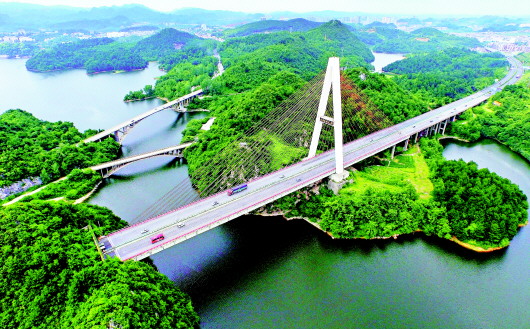 2004年9月29日,清镇至镇宁高速公路竣工通车,全长89.652公里,是贵州当时设计标准最高、服务设施最完善的高速公路,串连起了黄果树瀑布、龙宫、红枫湖等风景名胜。红枫湖大桥是贵州第一座不对称独塔双索面预应力混凝土斜拉桥,大桥与1982年建成的老花渔洞大桥和1990年建成的花渔洞大桥构成一道独特的风景线,也是贵州桥梁发展的历史见证。