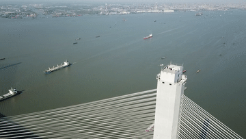 跟随中铁上海局集团公司上海工务段的工人,记者乘电梯后再爬楼梯,这才登上巍峨的大桥主塔。江风簌簌扑面而来,斜拉的缆绳从记者身下“放射”出巨大“双翅”,牢牢“搂”住车水马龙的公路桥面。远处,蓝色的钢拱穿越桥面,将下层的铁路桥稳稳地“锁”在桥墩上。