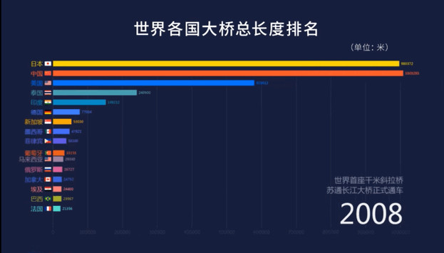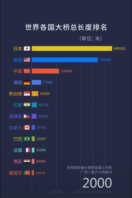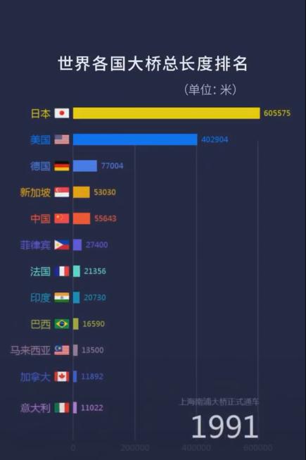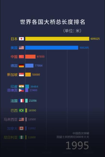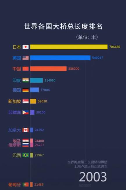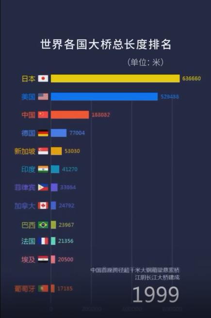 1分钟,一起感受1900年至2021年间,中国桥梁总长度是如何“加速度超车”世界各国的……↓↓↓