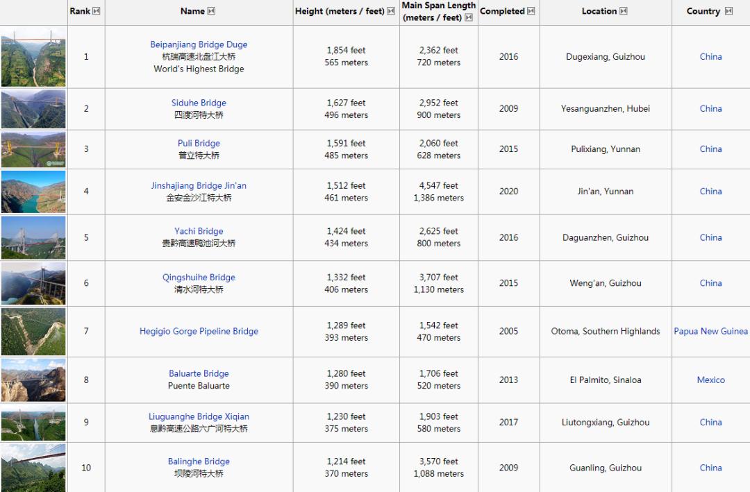 世界上最高的桥梁中,前10名中有8个属于中国。