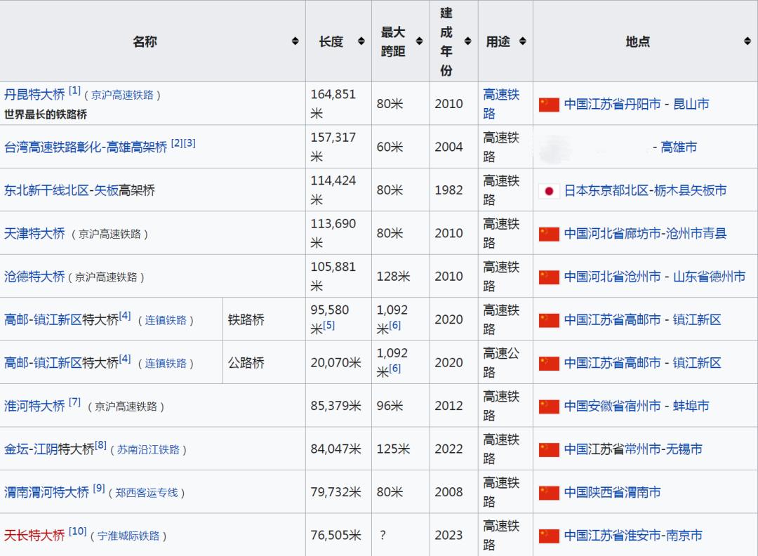 如果按照大桥长度排名,世界排名前10的大桥中,有9座都在中国。其中8座位于大陆,还有一座位于台湾省。