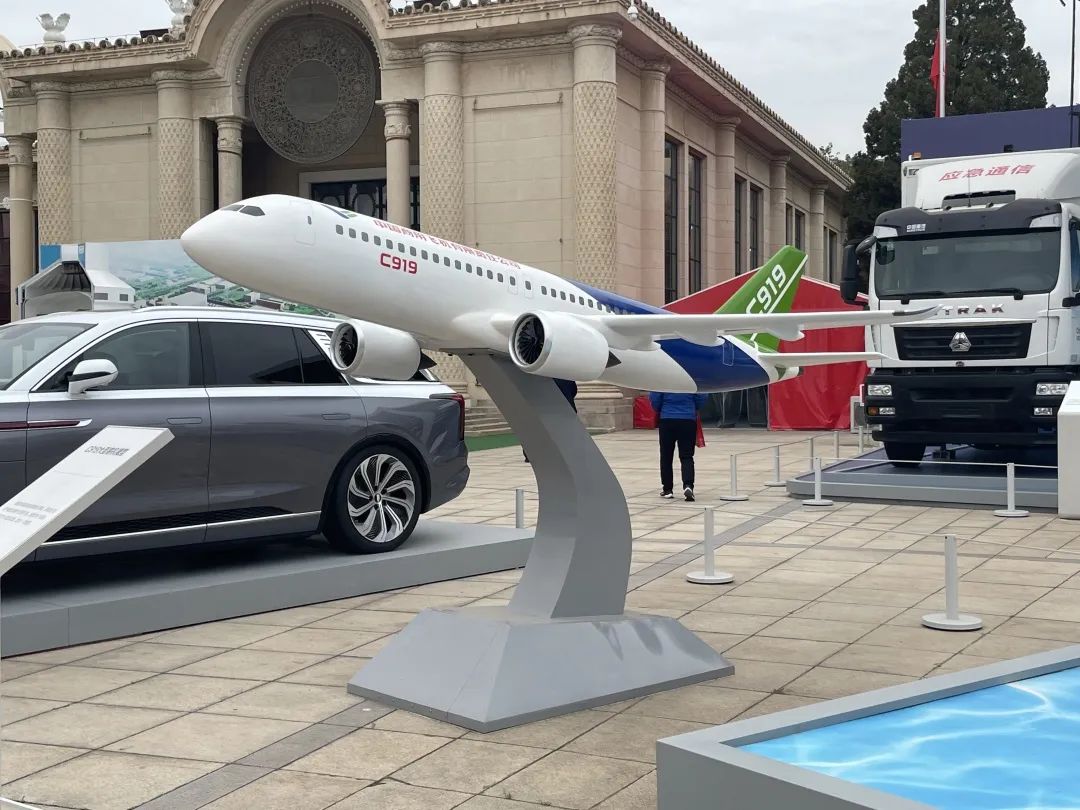 成就展室外展区,蓝天白云下,C919模型振翅欲飞,观众们在这里驻足、拍照。C919大型客机研制成功,获得型号合格证,标志着我国具备自主研制世界一流大型客机能力,是我国大飞机事业发展的重要里程碑。