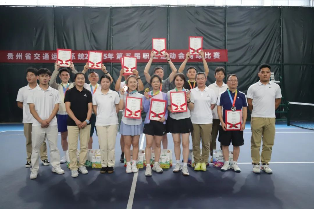 经过多轮鏖战,来自贵州交投集团二队的王荣有、贵州交职大代表队的罗文全、省交通执法监督局四队的杨龙祥分别获得贵州省交通运输系统2025年第五届职工运动会网球比赛男子组第一名、第二名、第三名;来自贵州高速集团一队的邵艳、贵州交通技师学院代表队的张丽丽、贵州高速集团二队的李雯雯分别获得贵州省交通运输系统2025年第五届职工运动会网球比赛女子组第一名、第二名、第三名;来自省交通运输厅机关联队黄强和贵州交职大代表队罗文全,省交通执法监督局三队杨政武和省交通执法监督局四队杨龙祥,贵州交投集团二队王荣有和贵州交投集团一队王劲松分别获得贵州省交通运输系统2025年第五届职工运动会网球比赛双打组第一名、第二名、第三名。