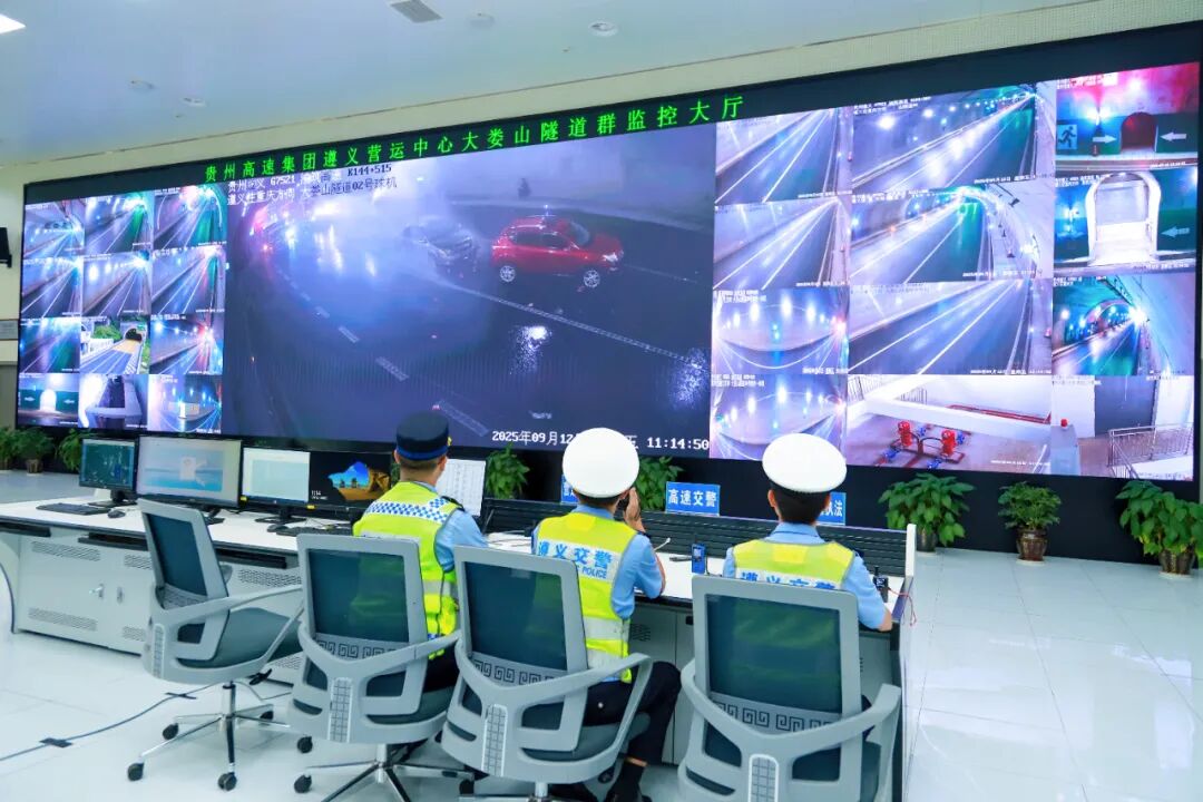 “报告指挥中心!G7521渝筑高速大娄山隧道下行K143+300处发生5车追尾,2辆小客车起火,交通中断,有人员滞留!”9月12日上午11时许,贵州高速集团遵义营运中心大娄山隧道群智慧管控一体化平台自动识别火情,同步触发预警机制。隧道内信号灯、车道指示灯、情报板、应急广播、风机等设备通过平台“一键启动”,为后续处置争取黄金时间。遵义营运中心迅速上报省交通信息与应急指挥中心、属地应急部门及高速集团,同时联动消防、医疗部门;在大娄山隧道内,一场贴近实战的高速公路特长隧道火灾救援应急演练正在有序开展。