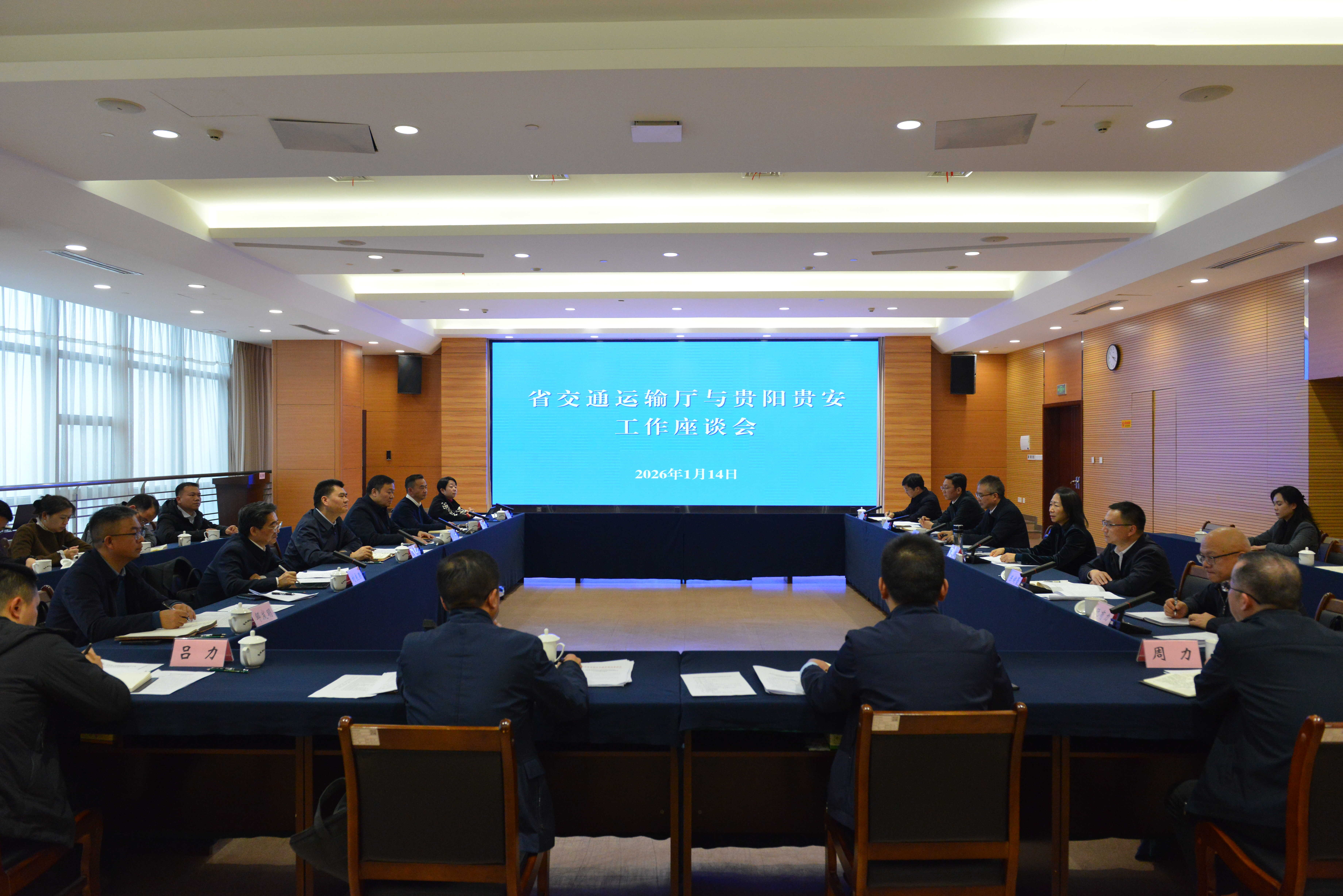 1月14日,省交通运输厅与贵阳贵安举行工作座谈会。省交通运输厅党委书记、厅长张胤,贵阳市委副书记、市长,贵安新区党工委副书记、管委会主任王宏出席会议并讲话。双方就“十五五”交通运输发展规划、重点项目建设、货运枢纽补链强链、强化水上交通安全等方面进行深入交流。省交通运输厅党委委员、副厅长陈健蕾,贵安新区党工委委员、管委会副主任李昂,贵阳市政府副市长刘良果,贵州高速集团总经理陈虎出席会议。