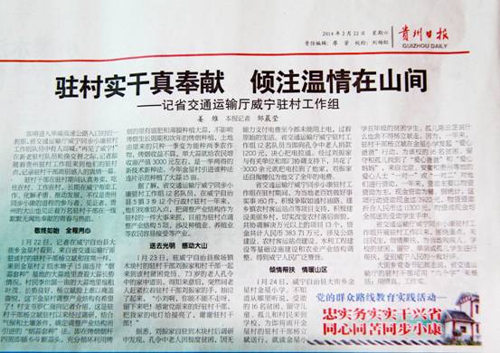 2014年2月22日,贵州日报以“驻村实干真奉献 倾注温情在山间”为题,报道我厅驻威宁县同步小康工作组的驻村帮扶工作。全文如下: