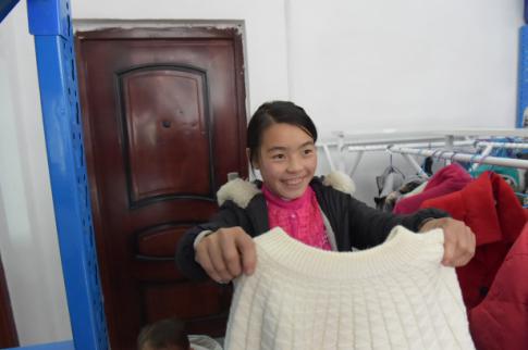 “我一直想要一件这样的毛衣!”一个小姑娘在电商云平台爱心服务站开心的向大家展示她为自己挑选的衣服