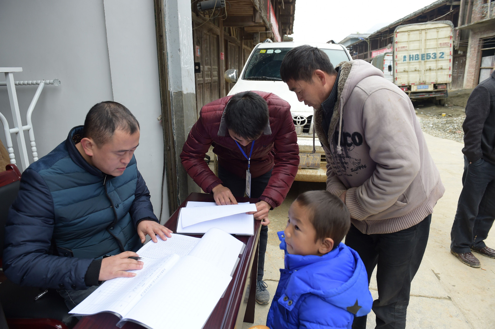 村民到电商云平台爱心服务站挑选捐赠的衣服后进行登记