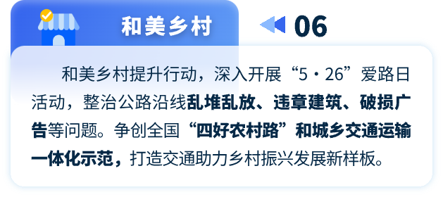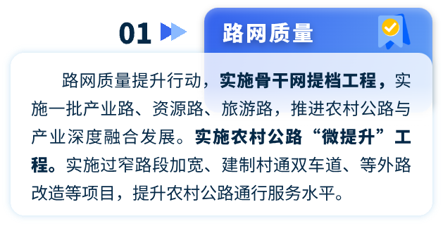 重点推进路网质量、安全、运输、治理能力、出行服务、和美乡村、助力产业、就业增收“八大提升行动”共19项任务。具体为: